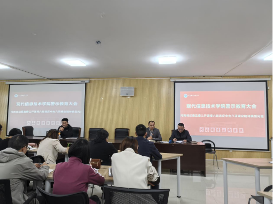 会议解读了《中共河南职业技术学院委员会贯彻落实中央八项规定精神实施办法(修订稿)》的核心要点,学习了《河南省纪委监委公开通报六起违反中央八项规定精神典型问题》和《河南职业技术学院领导干部“十不准”规定》。