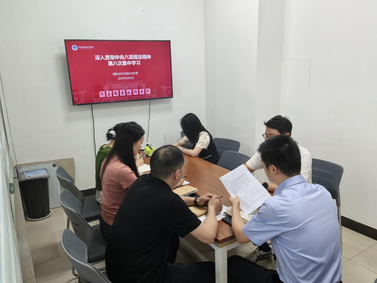 6月6日下午,学校国际合作交流处党支部在行政楼327办公室召开深入贯彻中央八项规定精神学习教育第八次集中学习。会议由党支部书记王伟主持,处室全体成员参与学习。