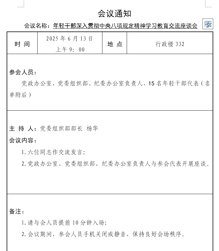 年轻干部深入贯彻中央八项规定精神学习教育交流座谈会通知