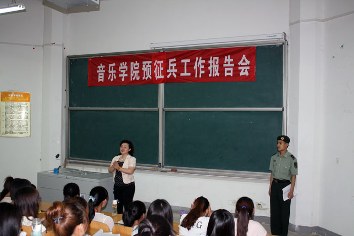 6月9日下午,音乐学院邀请河南省军区宣传处二级士官徐凯,在学院电教楼101教室举行了2011年音乐学院预征兵工作报告会。报告会由音乐学院副院长雷红薇主持,该院200多名学生参加。
