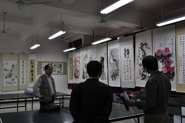 4月26日上午,由河南财经政法大学艺术系杨新宇主任和河南科技大学艺术与设计学院蒋鑫院长组成的“河南省第三届大学生艺术展演活动”专项工作检查组来汽车工程系实训楼505室参观“沐春风、浴古韵”书画摄影展览。