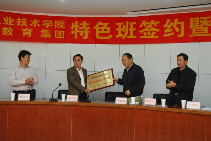 在安博教育集团为该院颁发 “校企共建实训基地”铜牌后,与特色班学生签署了就业服务推荐协议。