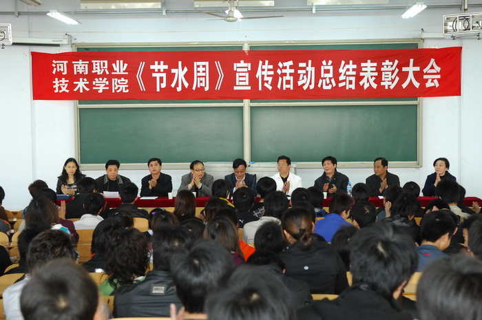 2010年 4月1日下午,我院节水宣传活动总结表彰大会在1101教室举行。郑州市节水办的领导任主任、李主席、杨总工程师及学院王院长、苏院长和团委学生处、后勤管理处的主要领导出席了大会,学院各系部学生代表共计300余人参加了会议。