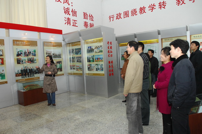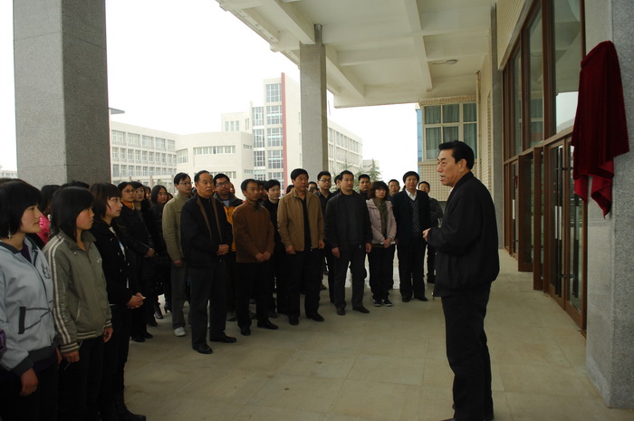 在揭牌仪式上,党委书记杨寿亭祝贺学院发展成果展室布展工作的圆满完成,并对在参与布展工作中付出艰辛劳动的同志表示感谢。他说学院发展到今天,汇聚了几代人的不懈努力,学院几经搬迁,现在的新校区,办学条件不断完善,已初具规模,学院各项事业正蓬勃发展,成为全国百所示范高职院校建设单位之一,并已入选全国就业60强单位,目前正向全国就业50强目标冲刺。他希望全体教职员工在看到学院迅速发展中取得可喜成绩的同时,进一步增强主人翁意识和责任感,继续为学院的各项事业繁荣发展做出新的更大的贡献,希望学生要进一步增强热爱学校意识,珍惜学习机会,在走向工作岗位后,要用自己的知识和技能服务社会,并常回母校看看,为母校的发展建言献策。