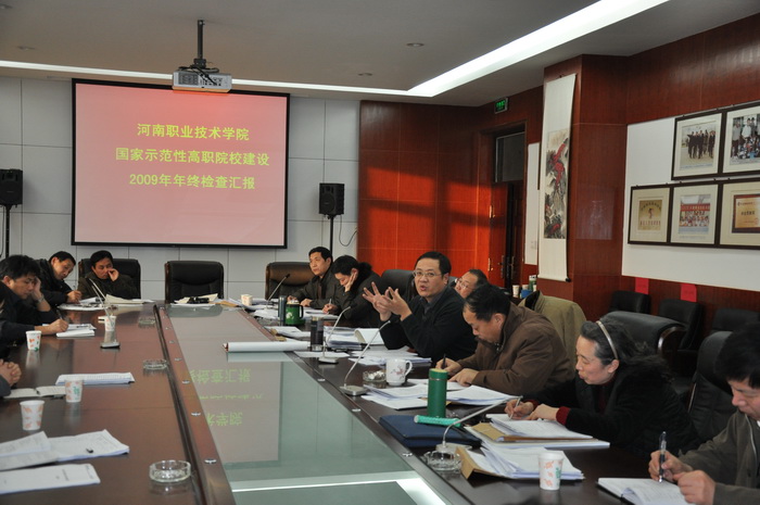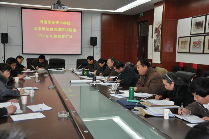 元月4日下午,我院国家示范性高职院校建设2009年度检查汇报会在院行政楼会议室召开,以王爱群院长任检查组组长、彭志宏副院长任副组长、由人事、两办、教务、财务、资产、示范办等部门负责人任成员的检查组成员和建设项目负责人及子项目负责人参加了会议。