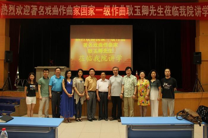 河南省人力资源和社会保障厅厅长、河南省玉卿戏曲音乐艺术研究院名誉院长杨盛道以“胜道”为笔名于6月11日在《河南日报》上刊发了《梨园有个耿玉卿》一文,引起省内外文化事业单位和艺术高校的高度关注。在这一背景下,耿玉卿走进河南大学校园为艺术学院师生作专题学术报告。在近三个小时的讲座上,他从自己初识豫剧开讲,年过古稀的他每到动情处还不时富有激情演唱起自己创腔设计的戏曲作品《情断状元楼》、《香魂女》等多部作品的曲段,优美考究的唱腔赢得了师生阵阵掌声。他还从剧种曲牌、板式唱法、唱词分析等角度入手,与在场师生探讨当代豫剧的传承与创新之道。他用自己坎坷的创作经历来鼓舞年轻的学子,“将命运的苦难融进创作,给了人生更多的正能量,戏剧的创新虽然有风险,但要牢牢把握和体现中国文化的积淀”,“祖辈留下的豫剧需要创新,不能光学洋的东西,越有民族味儿的越接地气……”。他平和达观、欢乐开朗的气质感染了在座的每一位师生。