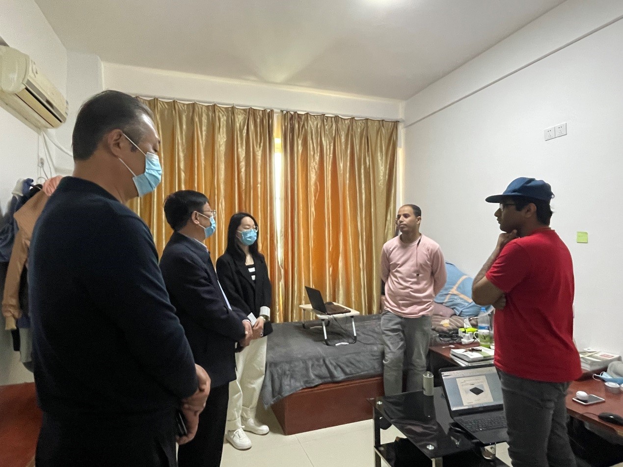 检查中,梅乐堂详细了解了留学生学习和生活情况,聆听他们的建议和诉求,并向留学生们介绍了当前严峻的疫情防控形势,叮嘱大家要严格遵守学校疫情防控规定和校规校纪,提高责任意识,积极主动配合做好核酸检测、每日健康打卡等防疫措施。同时希望留学生们要做到不点外卖,不聚集、不串门,养成良好学习生活习惯,加强锻炼,做好防护,共克时艰。