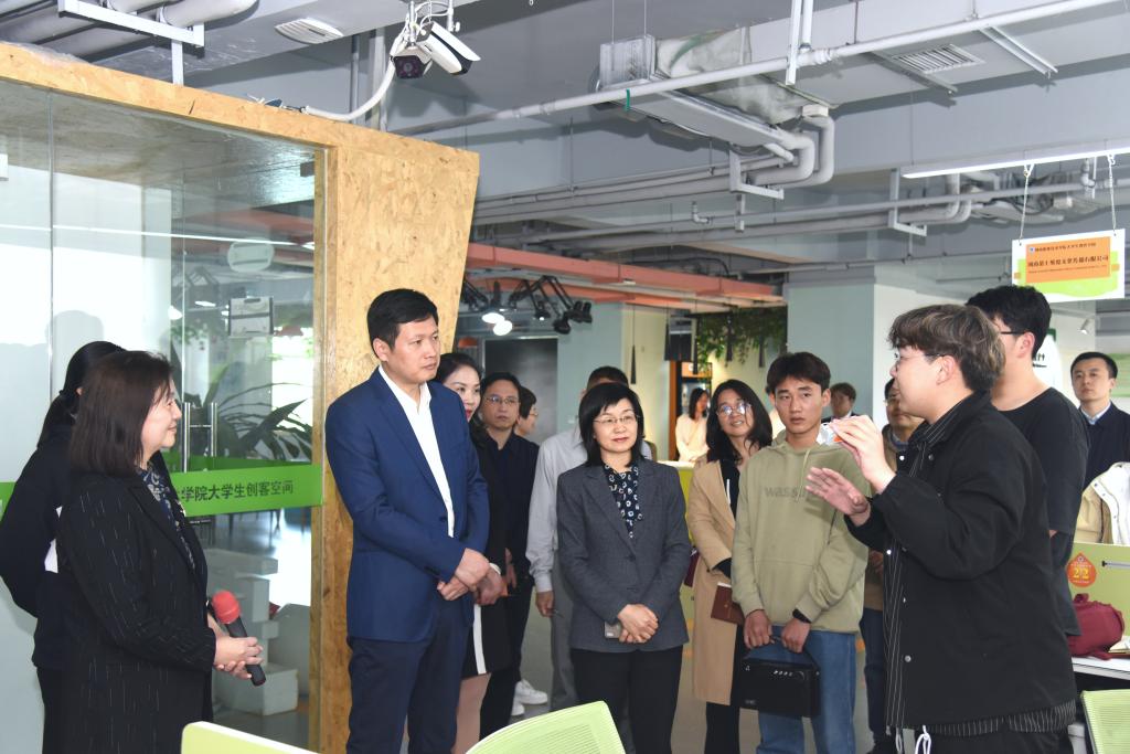 在创客空间,王笃波实地参观了苗圃区、文创区和科创区等区域,听取了创客空间整体概况、创业专业实验班的招生和开班情况的汇报,询问了学校服务青年学生就业创业的工作情况,并与“互联网+中国大学生创新创业大赛”金奖项目“声临其境——打造中国高端量产电子管音响轻奢品牌”和“蔓乐盎——中国领先的元宇宙国潮动漫IP服务商”等学生创业团队成员进行亲切交流,详细了解了学生创业历程,听取学生创业经验,并对同学们的创业项目提出了宝贵意见和建议。
