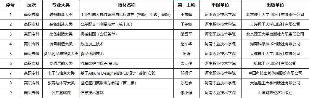 6月30日,教育部印发《教育部办公厅关于公布首批“十四五”职业教育国家规划教材书目的通知》,河南职院9种教材名列其中,教材入选数量在省高职院校中位列前茅,这是学校继获得首届国家优秀教材奖后的又一重大成果,也是学校“双高”建设重大标志性成果。
