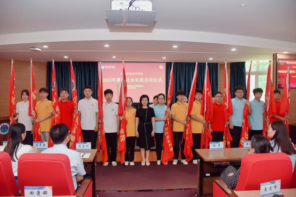 7月5日上午,河南职院在行政楼举办2023年暑期社会实践启动仪式。校党委书记李桂贞出席启动仪式并为实践团队授旗,工会主席夏喜利作动员讲话,宣传部、学工部、招生就业处和各二级学院相关负责人及140余名社会实践团队师生代表参会。