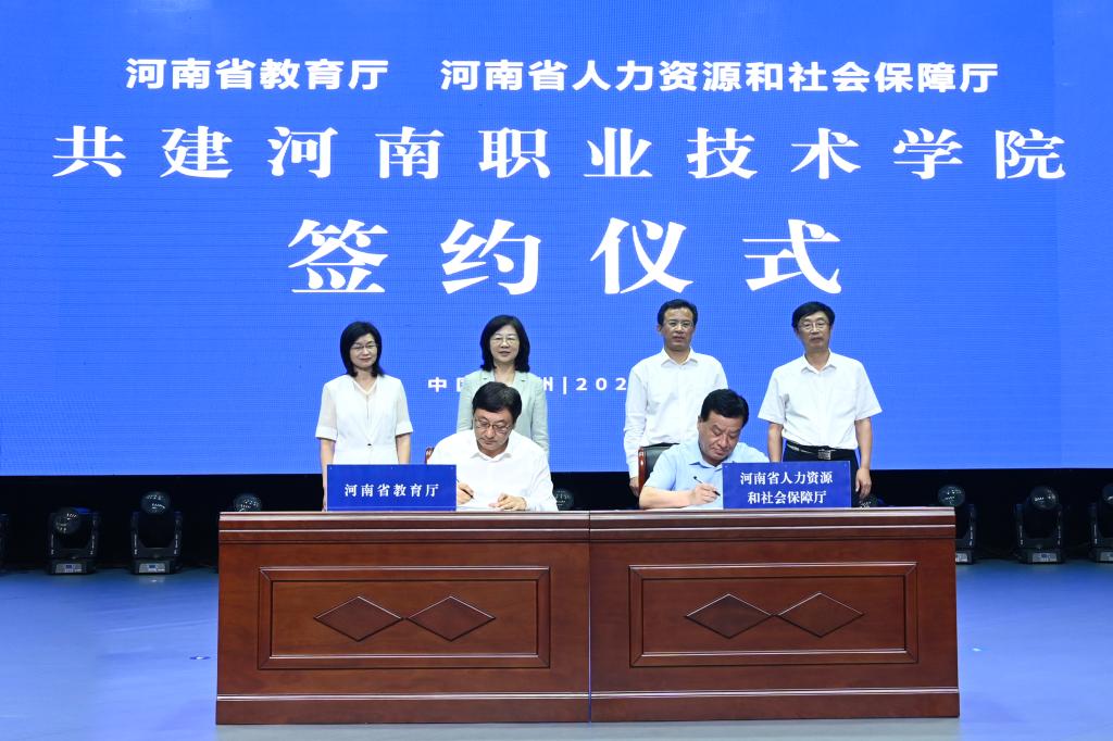 9月11日上午,河南省教育厅、河南省人力资源和社会保障厅共建河南职业技术学院签约仪式在学校音乐厅举行。省委教育工委副书记、省教育厅党组书记、厅长毛杰,省人力资源社会保障厅党组书记、厅长丁同民出席签约仪式并致辞。省人力资源社会保障厅党组成员、副厅长、一级巡视员李海龙出席签约仪式。签约仪式由省教育厅党组成员、副厅长朱自锋主持。两厅相关处室负责人,河南职业技术学院党委书记李桂贞、校长梅乐堂及领导班子成员、中层副职以上干部参加签约仪式。