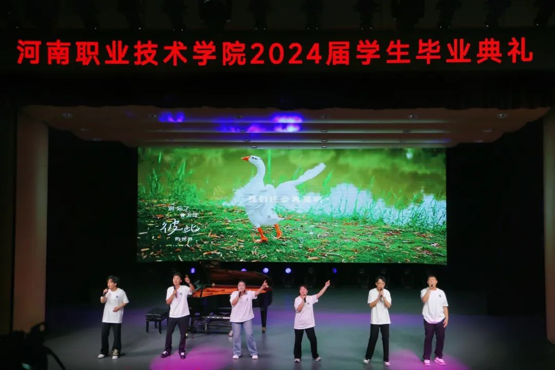 随后,与会师生一同观看了欢送毕业生的文艺汇演。教师代表演唱的歌曲《送别》、学生代表领唱的《再见》和《河南职业技术学院之歌》唤起了毕业生们对美好校园生活的怀念和不舍;健康操《点亮未来》、舞蹈《银杏》展现了河职学子的青春活力与美好追求。典礼在齐声诵读毛泽东诗词《忆秦娥·娄山关》和全场合唱《歌唱祖国》中缓缓落幕。(供稿:刘明库,审稿:姚晓辉)