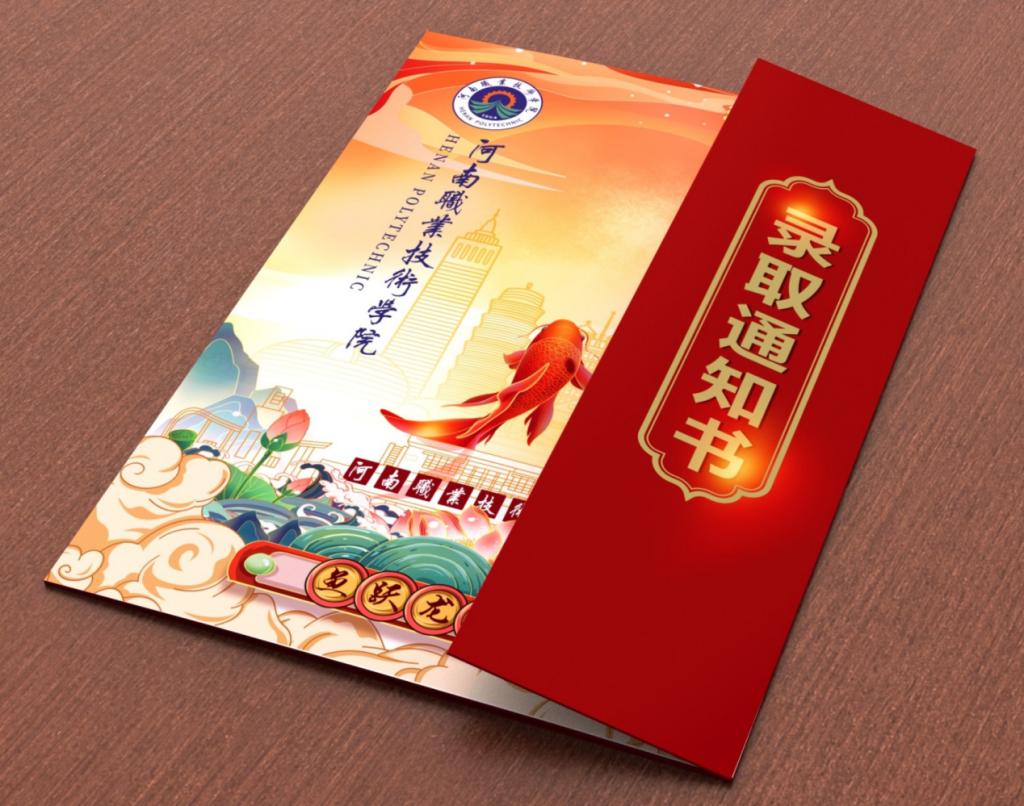 学校2024年的录取通知书在设计上别出心裁,由数字创意与设计学院赵永立、朱函兵和王兆阳三位老师共同设计,整体风格典雅而庄重。通知书封面以喜庆的红色为主色调,融入国潮风,搭配温馨又不失庄重的玫瑰金色,营造出一种既正式又充满活力的氛围。设计上巧妙融合了校徽与标志性建筑——校门的线条图案,象征着学子们即将跃过“龙门”,成为河职大家庭的一员,寓意深远且富有激励性。