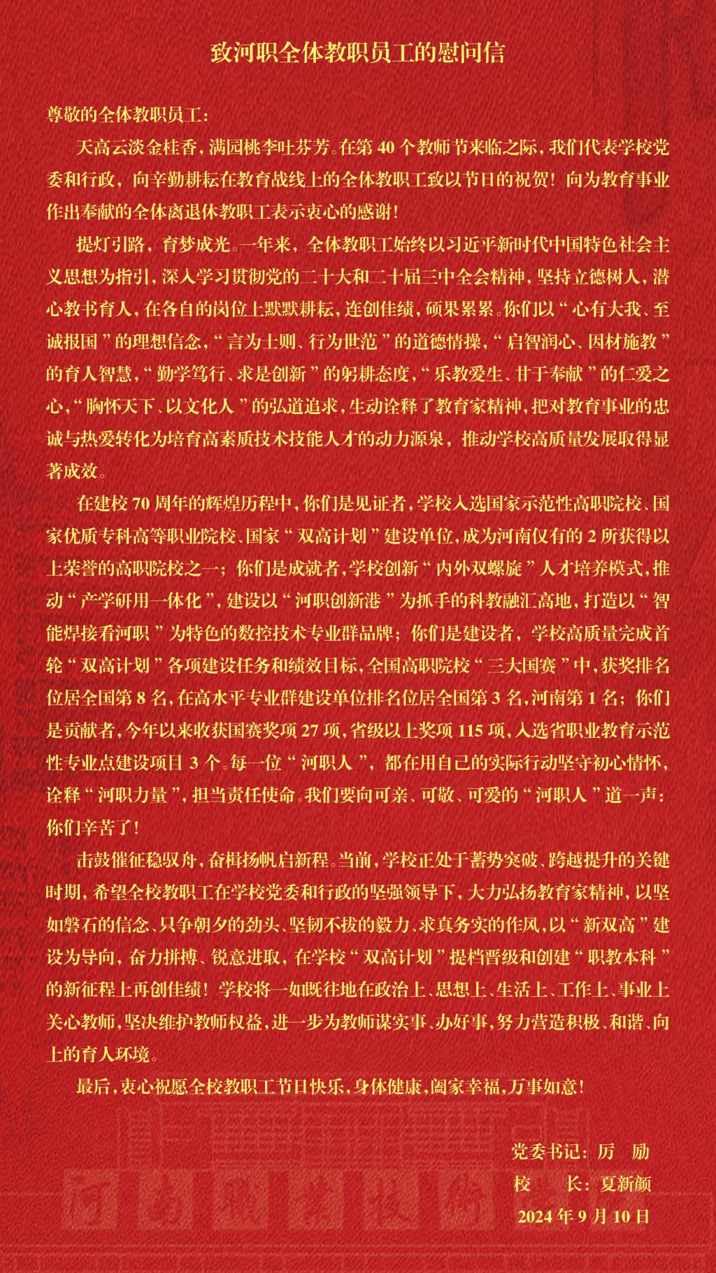 致河职全体教职员工的慰问信