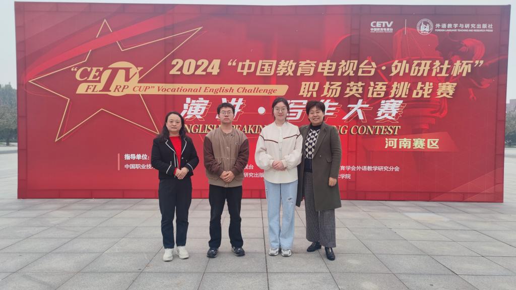 10月26日至27日,“中国教育电视台·外研社杯”职场英语挑战赛演讲·写作大赛(河南赛区)在鹤壁举行。学校国际教育学院黄圣涵同学获演讲大赛一等奖,电子与物联网学院付佳仪和财经管理学院卫己元两名同学分获写作大赛一等奖;基础教学部刘婷婷、吴希博和崔艳霞等三位教师分获指导教师一等奖。