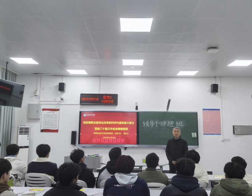 12月24日下午,校党委委员、纪委书记盛兴文以《深刻理解全面深化改革的科学内涵和重大意义》为题,为现代信息技术学院人工智能专业241班学生讲授思政课,并进行座谈交流。