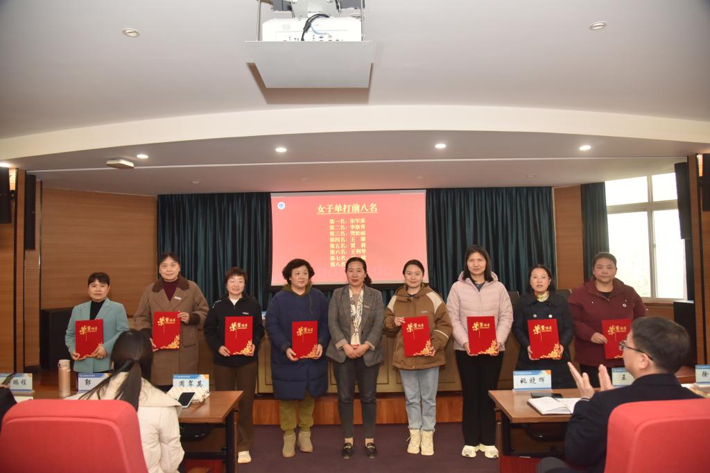 12月23日下午,学校在行政楼238会议室举行第十三届教职工乒乓球比赛闭幕式。校党委副书记、校长夏新颜,校党委副书记、工会主席田华出席闭幕式,并分别为获得本届乒乓球比赛的男女团体和男女单打前八名运动员颁奖。校分工会负责人、全体参赛运动员参加闭幕式。