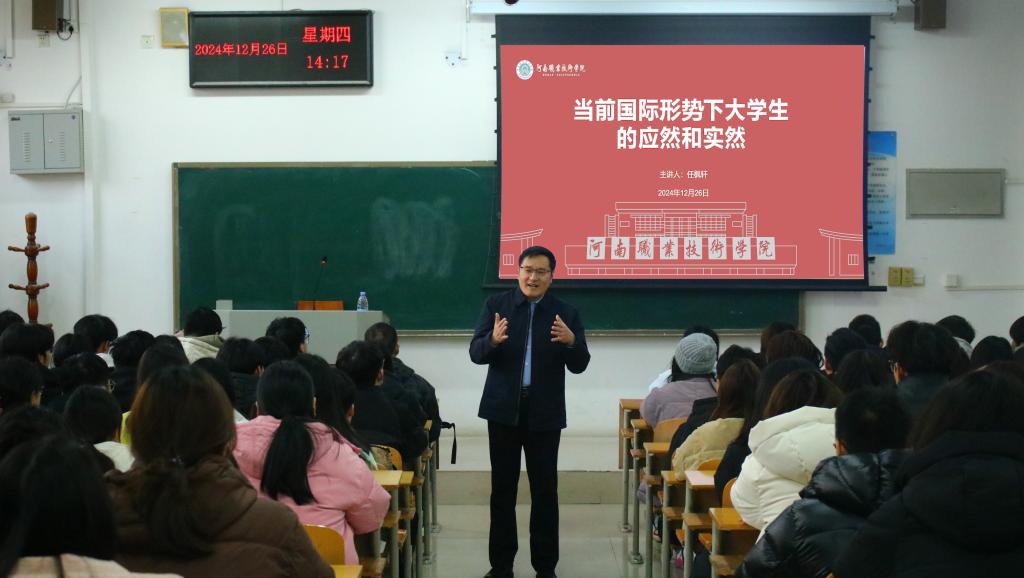 12月26日下午,校党委委员、副校长任枫轩以“当前国际形势下大学生的应然和实然”为题,先后为电子与物联网学院电子专业2024级学生和数字创意与设计学院数字媒体技术专业2024级学生讲授思政课,并进行座谈交流。