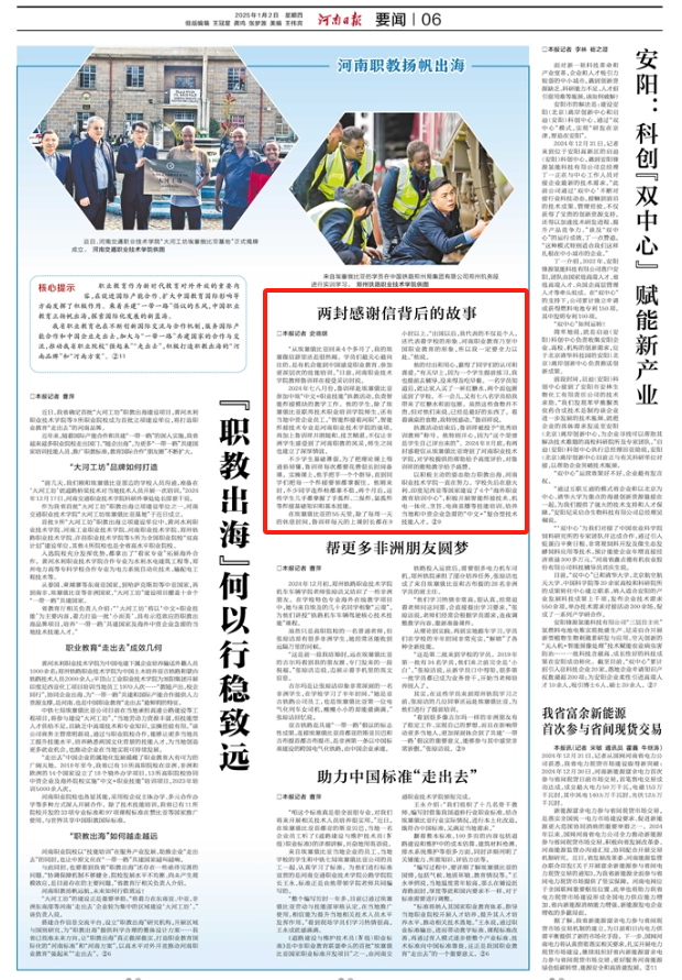以积极主动的姿态助力职教出海,河南职业技术学院一直在努力。学校先后在意大利、印度尼西亚等国家建设了4个“海外职业教育培训中心”,积极开展智能焊接技术、机电一体化、烹饪、电商直播等技能培训,培养当地和中资企业急需的“中文+”复合型技术技能人才。文章来源:《河南日报》(2025年01月02日 第06版)“两封感谢信背后的故事”。