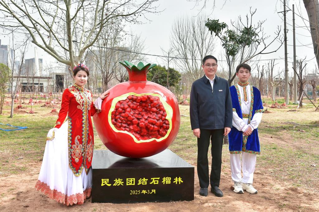 最后,厉励与师生代表共同为“民族团结石榴林”揭牌;师生们共同栽种了56棵石榴树,象征56个民族像石榴籽一样紧紧抱在一起,心连心、手挽手,共同构建中华民族大家庭。(供稿:隋纳新,审稿:吴猛)