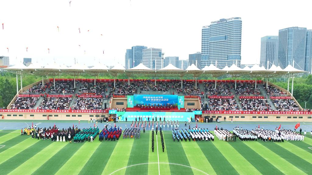 绿树阴浓,繁花似锦。5月8日上午,河南职院第十四届田径运动会隆重开幕。校领导厉励、夏新颜、田华、李玉峰、盛兴文、任枫轩、鲁冬、朱永宽出席开幕式。校属各单位党政负责同志在主席台就坐。近5000余名师生参加开幕式。开幕式由校党委委员、副校长肖珑主持。