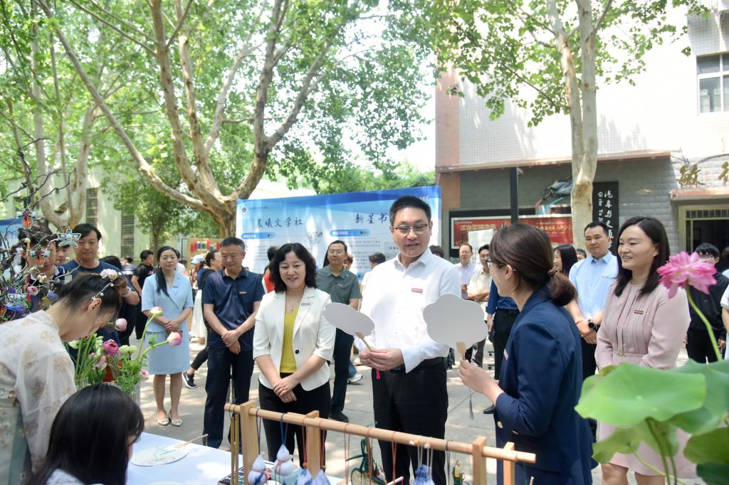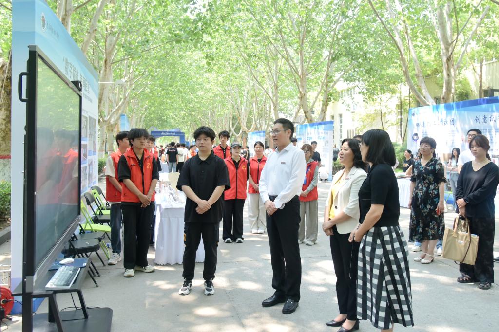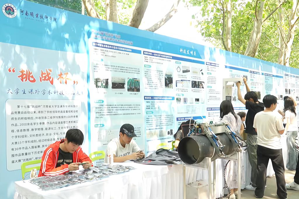 本次活动分为美育文化、挑战杯作品、社团风采等三大成果展区,全方位展示了学校美育文化、科技创新和社团活动的丰硕成果。在美育文化展区,12个二级学院立足自身实际,将美育文化与专业特色深度融合,展示了科技创新、创意手工等作品,彰显了专业建设与美育浸润成果;在第十七届“挑战杯”河南省大学生课外学术科技作品展区,19个决赛入围项目精彩呈现、百花齐放,展现了学校科技赋能成效和学生们勇于创新、敢于实践的精神风貌;在社团风采展区,20个学生社团各展其长,通过音乐舞蹈、舞狮表演、创意烹饪、互动游戏等多种形式,展示了学生们丰富多彩的兴趣爱好和青春洋溢的校园文化生活。