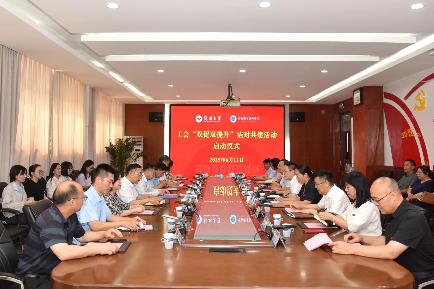 6月11日下午,河南职院与郑州大学在学校勤业楼举行工会“双促双提升”结对共建签约仪式。郑州大学党委副书记、工会主席韩国河,校党委书记厉励出席签约仪式并致辞。郑州大学工会副主席杨根顺,校党委委员、副校长朱永宽参加签约仪式。校党委副书记、工会主席田华主持签约仪式。