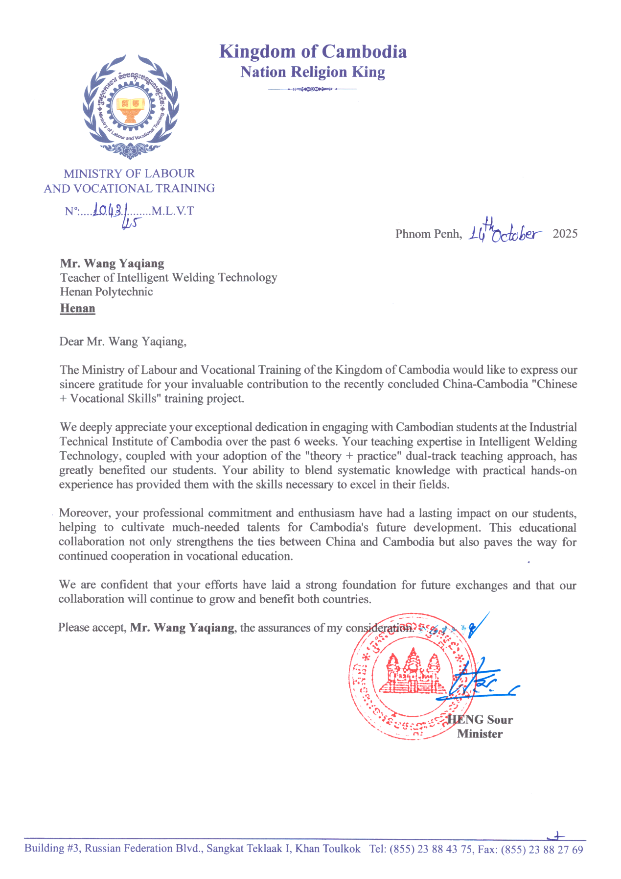 近日,学校收到来自柬埔寨劳工与职业培训部和工业技术学院发来的两封感谢信。信中写道:感谢你们为中国—柬埔寨“中文+职业技能”项目所做的贡献,王亚强老师倾心指导柬埔寨学员的敬业精神令人感佩,您凭借智能焊接技术领域的专业造诣,采用“理论+实践”双轨并行的教学模式,使学员们受益匪浅……