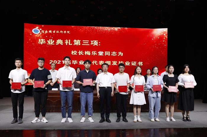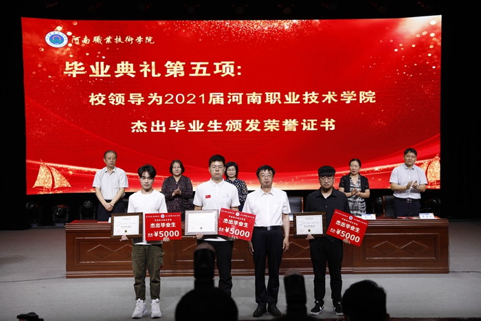 校工会主席夏喜利同志宣读了河南省2021年优秀毕业生表彰文件及我校2021年杰出毕业生表彰文件;校领导为毕业生代表颁发了毕业证书,为河南省优秀毕业生代表颁发了荣誉证书,为我校三位杰出毕业生颁发了荣誉证书及奖金。