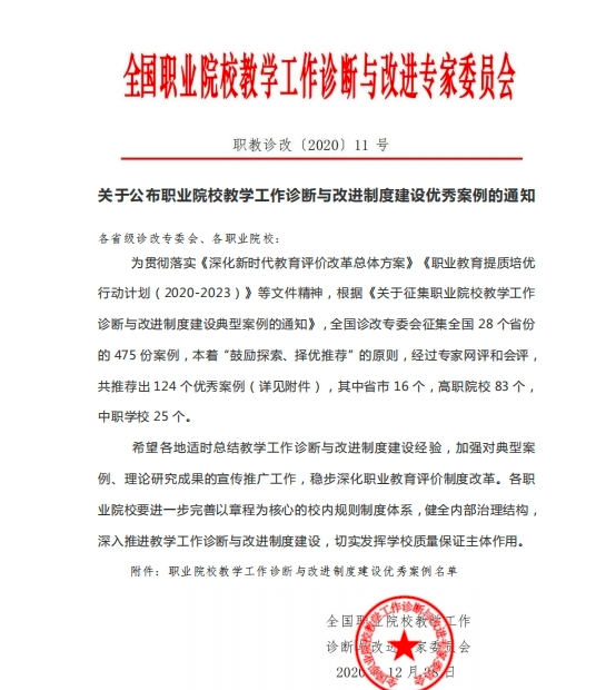 近日,全国职业院校教学工作诊断与改进专家委员会下发《关于公布职业院校教学工作诊断与改进制度建设优秀案例的通知》(职教诊改〔2020〕11号),我校诊改案例“内外兼修、数据护航,不断提升专业课程诊改实效”成功入选全国职业院校教学工作诊断与改进制度建设优秀案例。