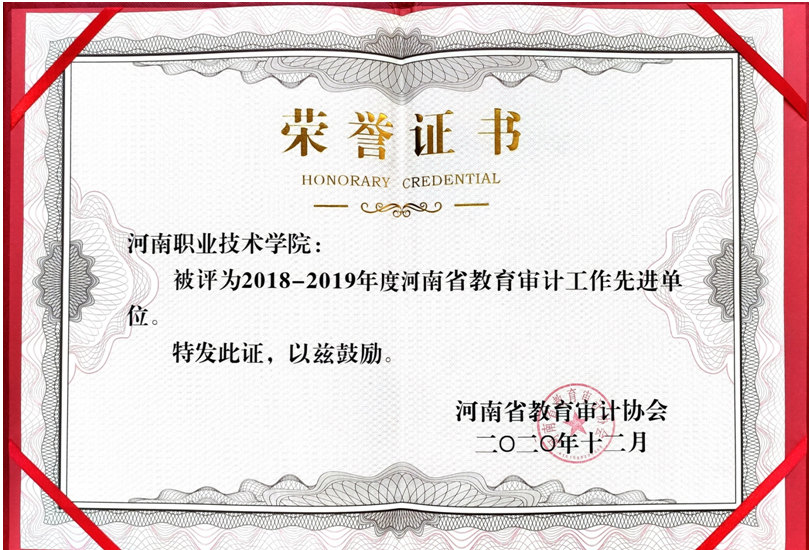 岁末将至,喜讯再传。近日,河南省教育审计协会对全省教育系统内部审计工作进行表彰,公布了“关于表彰2018-2019年度教育系统内部审计工作先进单位和先进工作者的决定”,我校荣获“河南省教育审计工作先进单位”,贾卓杰同志荣获“河南省教育审计先进工作者”。