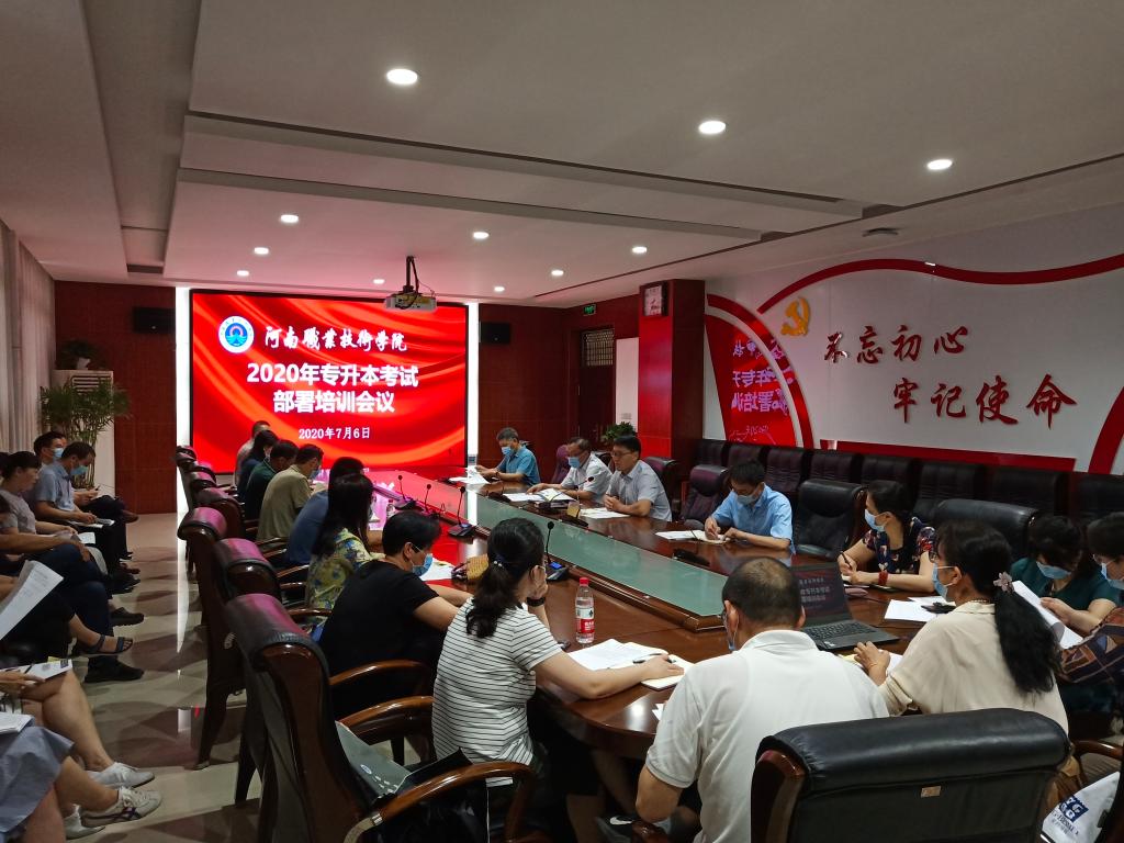 为确保我校2020年专升本学生考试工作平稳有序开展,7月6日上午,我校在行政楼238会议室召开2020年专升本考试部署培训会,学校工会主席夏喜利,相关职能部门负责人和各二级学院负责同志参会。