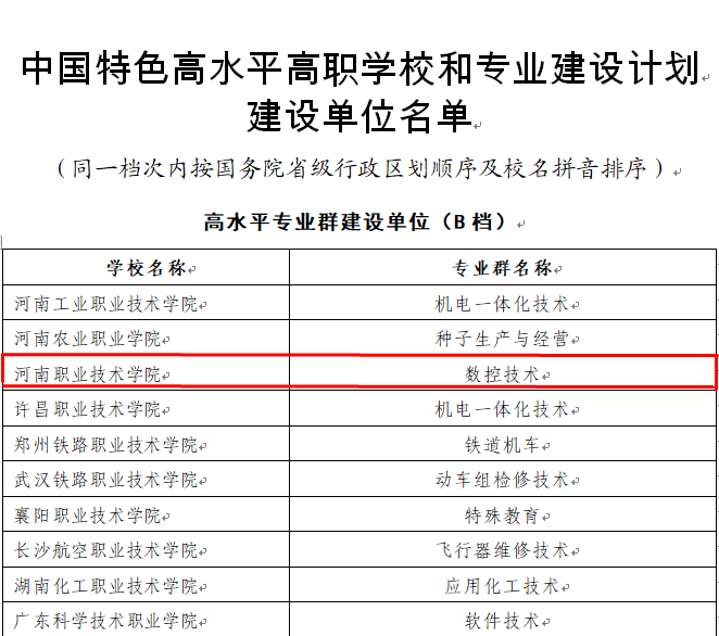 12月18日,教育部、财政部发布了《关于公布中国特色高水平高职学校和专业建设计划建设单位名单的通知》, 我校入选“中国特色高水平高职学校和专业建设计划”(简称“双高计划”)高水平专业群建设单位。这也是我校继国家示范性高等职业院校、国家级优质高等职业院校后,在改革发展中又一新的重大成果。