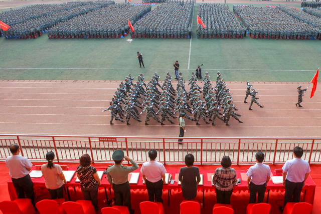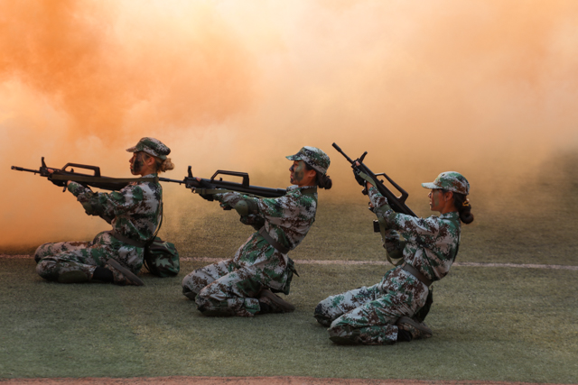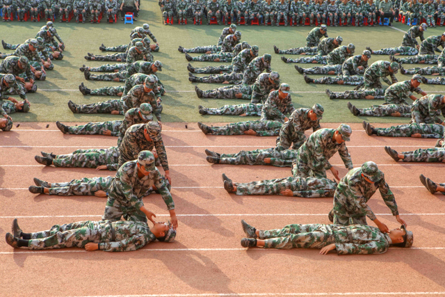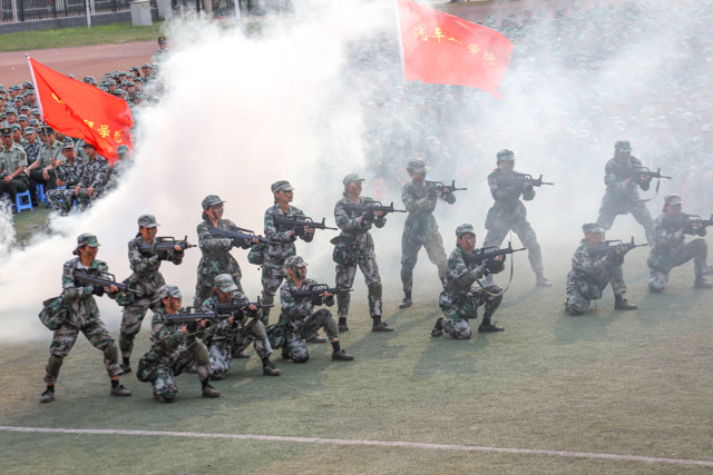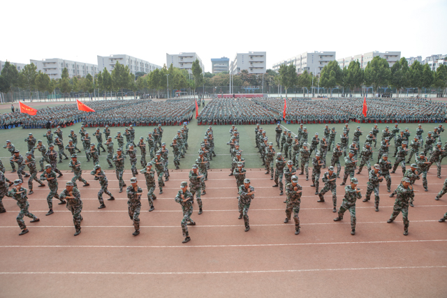 大会伊始,李四清书记下达军训会操开始指令,大会在雄壮的国歌声中拉开帷幕。9个二级学院分列式方队,身着迷彩精神抖擞,正步通过主席台,接受与会领导的检阅。他们目光坚定、步伐自信、口号嘹亮、斗志昂扬,处处洋溢着青春的活力,更彰显着2019级河职新生顽强拼搏、锐意进取的精神。特别在擒敌拳、匕首操、心肺复苏、战术综合四项演练表演中,同学们高标准的战术动作、高素质的执行能力、高精准的团队协作和高沸点的雷霆之气,深深带动和感染者在场的所有领导和师生,大家热血沸腾、掌声不息。