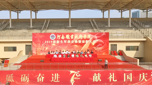 9月29日下午,我校2019级新生军训会操暨表彰大会在体育场隆重举行。河南省军区学生军训办公室部长闵克龙、学校领导和各二级学院党总支书记、副书记、全体新生辅导员,以及军训教官和8000余名新生参加了大会。党委书记李四清下达了军训会操开始指令,院长李桂贞向参训部队赠送锦旗,副院长肖珑宣读了受表彰人员名单,工会主席夏喜利主持大会。