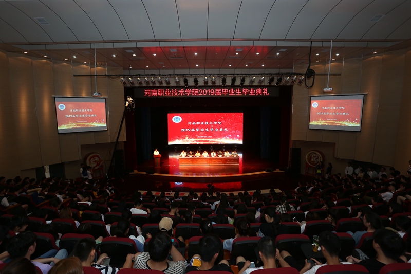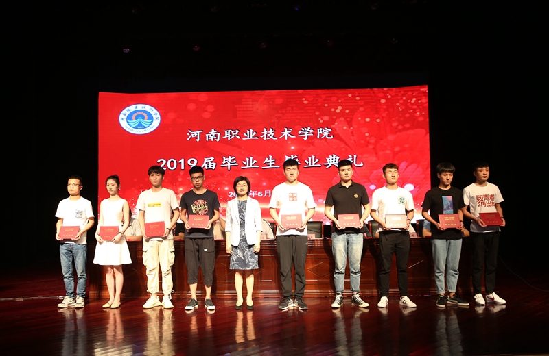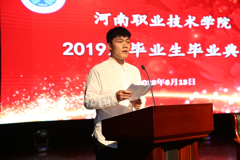 毕业典礼在雄壮的国歌声中正式开始。校工会主席夏喜利同志宣读了2019年河南省优秀应届毕业生表彰文件;校领导为2019届毕业生代表颁发了毕业证书,为2019届河南省优秀毕业生代表颁发了荣誉证书;电气工程学院毕业生黄栩然同学代表2019届毕业生回顾了三年的大学生活,对母校、老师、家长和同学们分别表示了感激之情,表示将承载学院领导、老师们的深情嘱托,做胸怀大志并脚踏实地的人,做德才兼备并勇于创新的人,在祖国的各个行业为河职争光;思想政治理论教学部马金伟作为教师代表为毕业生上了一节精彩的思政课。他从立志、奋斗、实干、乐观、努力等6个方面,用生动的事实和风趣地语言表达了学校全体教师对2019届毕业生的殷切期望和衷心祝福,希望他们谱好自己的青春之歌。