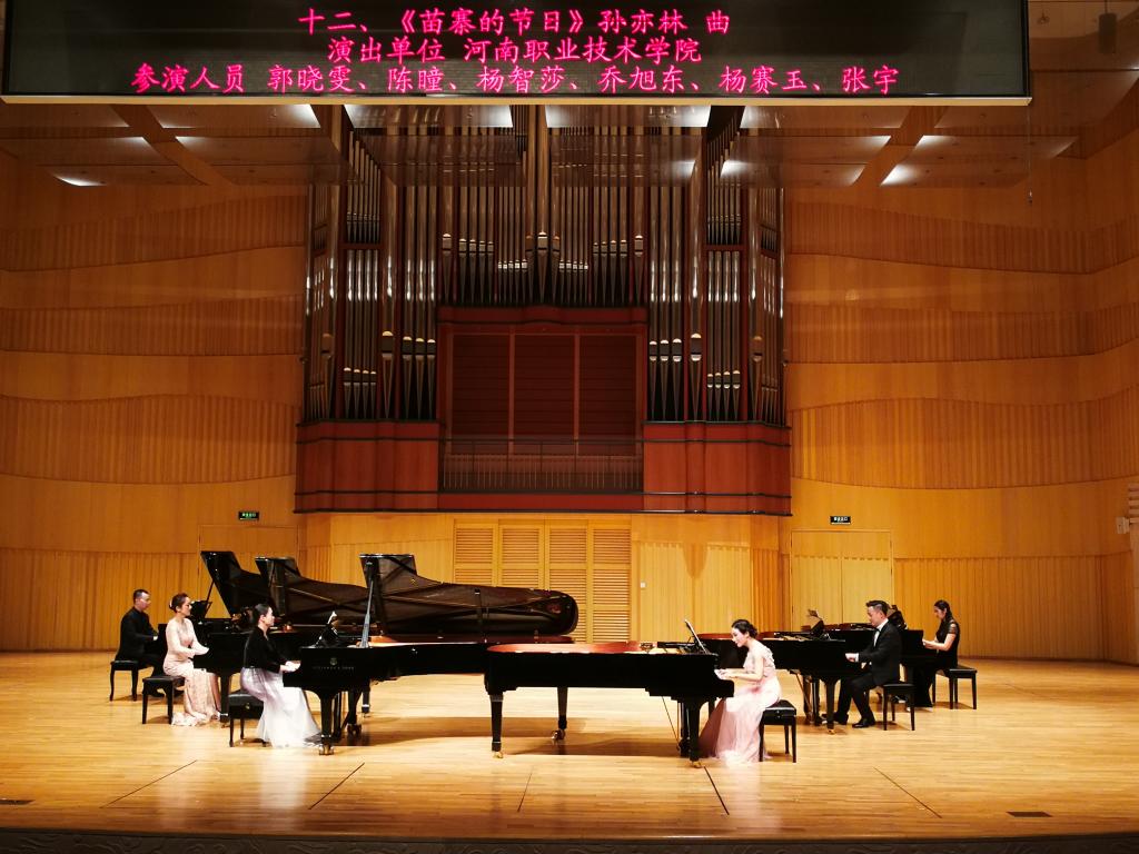 12月30日晚,由河南省音乐家协会主办的“致敬改革开放四十周年钢琴演奏系列活动之2019新年钢琴音乐会——河南高校多钢琴重奏合奏音乐会”在河南艺术中心音乐厅成功举办。我校音乐学院钢琴教研室教学团队代表学校参加,并展演了中国民歌风格双钢琴作品《苗寨的节日》。
