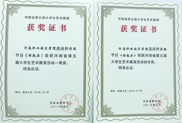 近日,河南省第五届大学生艺术展演活动评选结果揭晓。我校师生在本届艺术展演活动中荣获一个一等奖、三个二等奖和两个三等奖的好成绩。
