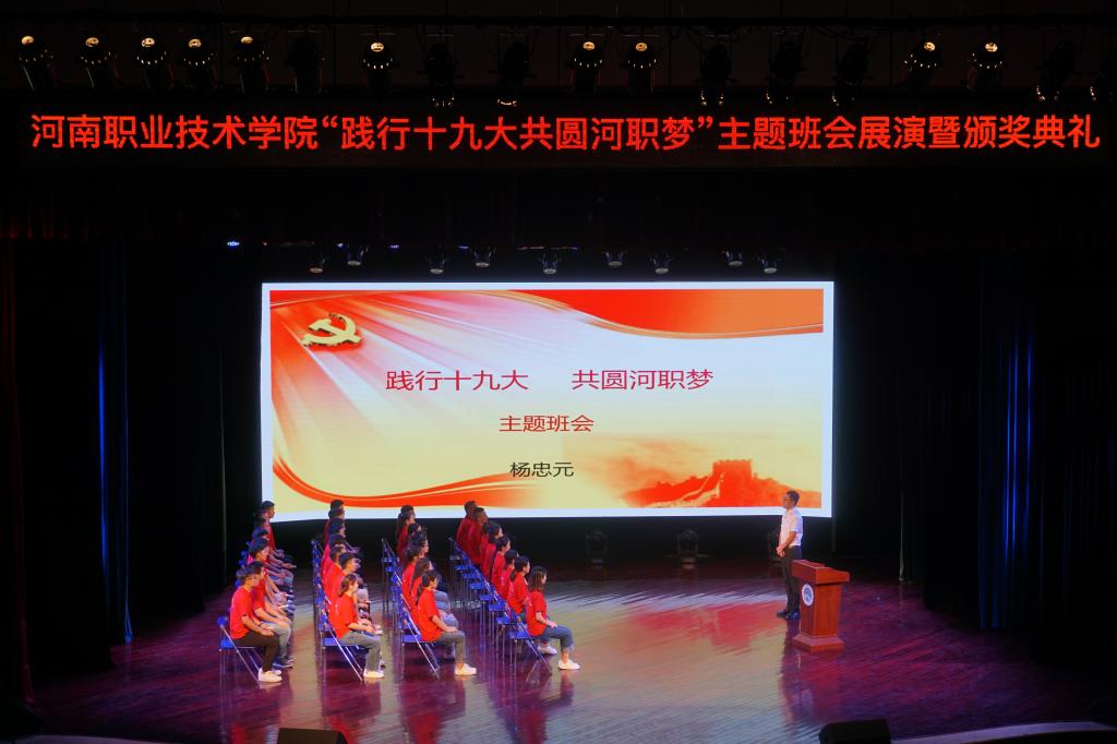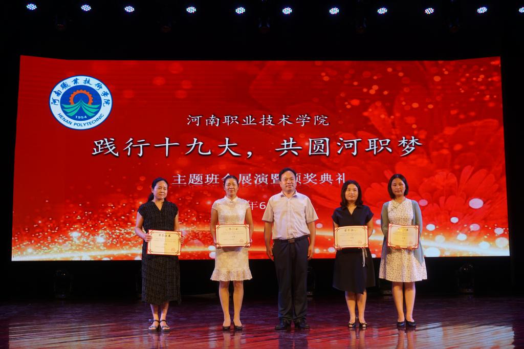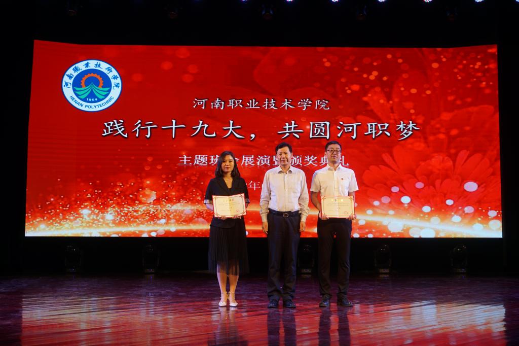 活动现场,李四清书记和占江副书记分别为主题班会获奖个人和单位进行了颁奖。烹饪食品与健康学院辅导员杨忠元、商学院辅导员张佳和机电工程学院辅导员樊林等主题班会比赛前三名获得者,分别利用视频播放、PPT展示、诗歌朗诵、小品表演和现场讲解等方式,把主题班会搬上舞台,进行了现场展演。通过对班会主题进行深入挖掘和精准阐述,使同学们深刻领会了习近平新时代中国特色社会主义思想,明白如何以实际行动为社会主义现代化做贡献,做一名有理想、有本领、有担当的优秀青年,为实现中华民族伟大复兴的“中国梦”和我的“河职梦”而不懈奋斗。