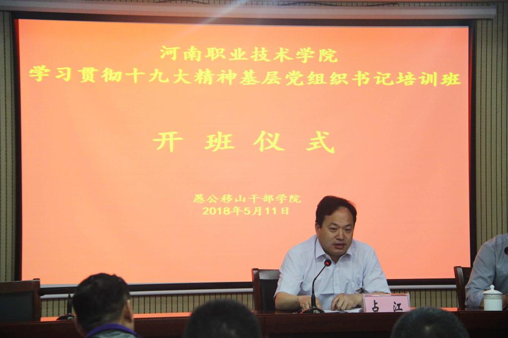 开班仪式上,占江同志作了题为《深入学习贯彻党的十九大精神全面提升基层党组织组织力》的主题报告。他指出,全体学员要深入学习贯彻习近平新时代中国特色社会主义思想和党的十九大精神的基本要求,强化思想引领,充分认识培训的重要意义;要提高政治站位,深刻理解支部工作的重要作用,把党支部建设作为学校党建工作最重要的基本建设;要增强责任意识,全面掌握支部工作的核心内容,提升党建工作水平;要切实履行好作为党支部书记的应尽之责,发挥本次培训班的效能,做好基层党组织的“带头人”。愚公移山精神干部学院副院长贺志华致欢迎词,他希望参训的全体学员要珍惜机会,深入学习党的十九大精神,将愚公移山的思想精髓带到今后的工作学习生活中去。