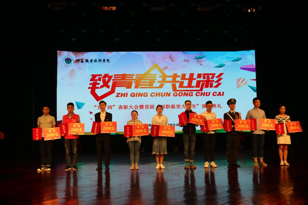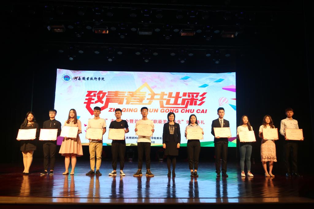 在青春洋溢的开场舞《梦的引擎》后,首届“河职最美大学生”颁奖典礼正式拉开帷幕。他们当中有“军旅之美”常军亚、“志愿之美”时文豪、“创新之美”程永超、“服务之美”丁玉、“支教之美”郑梅、“自强之美”李汇才、“创业之美”刘劲、“爱国之美”高乃玄、“孝心之美”郑怀钰、“技能之美”范婕。颁奖典礼上展示了十位“河职最美大学生”的先进事迹,并由各二级学院党总支书记为他们颁奖。