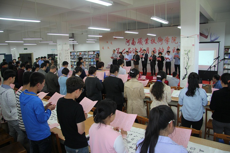 会上,焦军普、白广思两位校外专家及我校万久玲、雷红薇、王延东和高昂等六位同志受聘为“河南职业技术学院全民阅读活动推广人”,校领导为他们颁发了聘书。随后,推广人万久玲教授带领现场师生一同诵读经典著作《大学》(节选),大家的声音响彻整个报告厅,在场师生都被这浓浓的书香气息所感染,把整场活动推向了高潮。