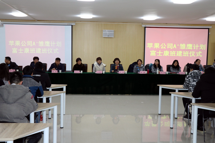 1月5日上午,苹果公司供应链教育经理孙巍会同富士康集团校企合作课资深专理王欢一行5人来我院,参加在学院综合楼举行的A+雏鹰计划富士康班建班仪式。学院副院长肖珑,机电工程系、电气工程系和合作办学处等部门相关负责人,以及A+雏鹰计划富士康班的56名学生共同参加了建班仪式。