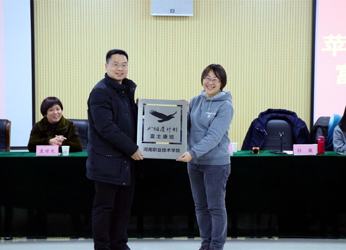 仪式上,肖珑副院长指出,学院与国际知名企业开展深度校企合作,拓展人才培养新模式,运用课程体系改革新方法,开辟产教全方位融合新途径,将为学院创新发展行动和优质校建设注入新亮点。苹果公司和富士康集团代表分别从个人职业发展与企业选人用人机制等方面,对参会学生今后如何成就自我精彩人生给出了指导性建议,同时也真诚地祝愿每一位同学都能够取得优异成绩。随后,苹果公司与我院进行了“A+雏鹰计划富士康班”牌匾交接,并向全体学员发放了专班胸章。最后,苹果公司与富士康集团负责人向我院在A+雏鹰计划项目宣传推广工作中表现优秀的种子团队进行表彰,并向专班学生代表发放了录用通知书。