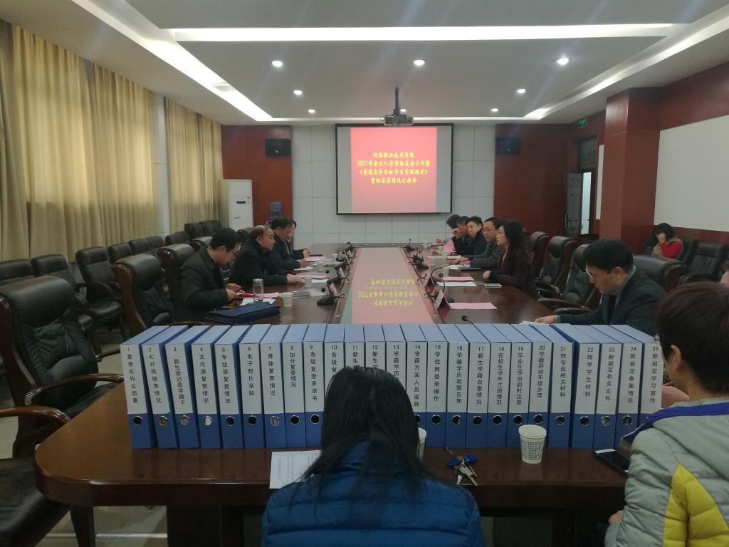 12月22日上午,以平顶山学院副院长闫天德为组长的省教育厅专家组一行四人,来我院督查2017年新生入学资格复查工作和《普通高等学校学生管理规定》贯彻落实情况。院长李桂贞主持会议,并对专家组的到来表示欢迎。纪检监察室、教务处、后勤管理处、招生就业处和学生处等相关部门负责人,以及各系(院)党总支书记共20余人参加了汇报会。