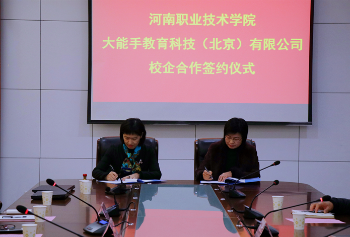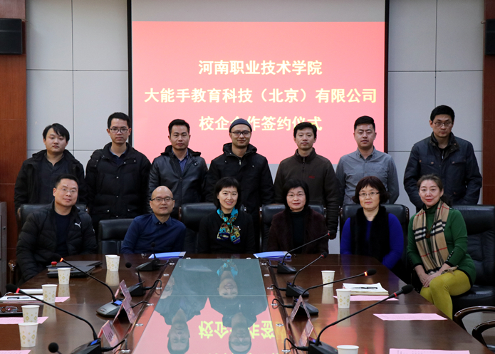 12月15日下午,大能手教育科技(北京)有限公司总经理陈锦春一行9人到访我院,与我院就河南省电子商务职业教育集团项目签署校企合作协议。院长李桂贞和副院长肖珑出席了签约仪式。合作办学处和信息工程系相关负责人也参加了签约仪式。签约仪式在行政楼A303会议室举行。