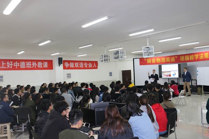 为提高物流专业学生学习专业英语的兴趣,成为双语专业人,同时在我院教师中形成“学习德国教学法,争做河职名师”的热潮,10月30日至31日,我院工商管理系与合作企业北京思威普智业投资有限公司联合举办“展会物流英语”-德国教学法观摩课。“中德物流班”学生、外籍教师代表、企业代表和我院部分教师代表共150余人参加了观摩活动。