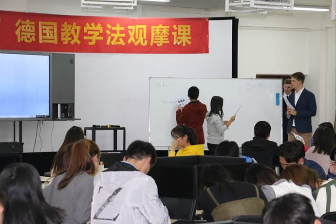 观摩课上,外教Tobias Rothe与Oliver JonathanBruetzel,一个主讲,一个辅助,交替授课,以展会物流专业英语为主题,从两组同学PK抢答开场,设置了建立企业的必要条件,企业运营的核心关键,和企业如何布置展台、如何参加展会等情境依次开展教学,学生跟着外教设置的情境,积极参与问题讨论,勇敢地上台进行学习成果展示。参加活动的教师普遍表示学习到了一堂地道的“德国课”的授课方法、教学设计和课堂组织形式,受益匪浅,在以后的教学中要积极改革自己的教学方式,将“德国方法”引入到自己的课堂。现场的学生也充满了自信,课堂的互动和成果展示虽然英语说的磕磕巴巴不太流利,但一节课下来也学到了新的口语表达形式,改变了自己的思维模式,提高了学习的兴趣和热情。
