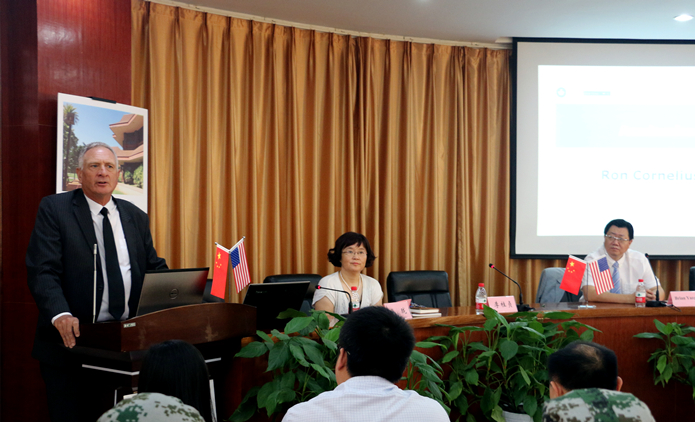 RonaldCornelius教授作为外方代表与参会新生进行了交流。他通过一个生动的视频导入,让大家思考未来的中国和世界需要什么样的人才。他说,通过中美合作办学三年的学习,希望所有同学可以从国际化课程中提升自身英语水平,融入国际化学习环境,拓宽国际化视野,坚定信心、确定学习目标,以饱满的热情开始自己的人生新篇章,通过自身努力实现自己的人生价值。