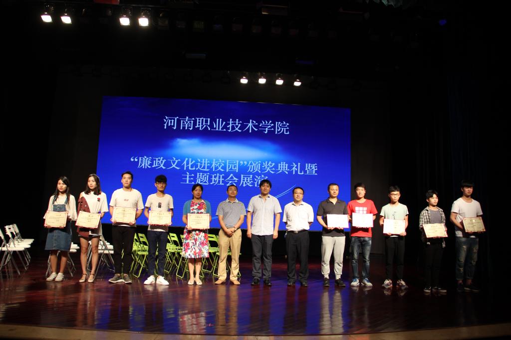 纪委副书记、监察室任主夏喜利宣读了“廉政文化进校园”系列活动表彰文件。占江副书记和纪检监察室、学工部、团委负责人,分别为优秀个人和优秀组织单位进行了颁奖。王林、马臻臻和梁静等三位主题班会获奖辅导员,分别作了“牵手你我他,共倡廉洁风”为主题的廉政文化主题班会展演。